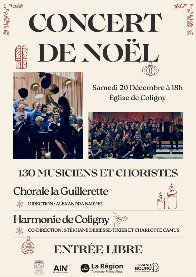 Tout au long de l’année, l’Harmonie de Coligny vous donne rendez-vous pour partager des moments musicaux conviviaux et festifs. Comme chaque année, nos concerts annuels auront lieu le premier week-end de mai, un rendez-vous incontournable qui met en valeur le travail et l’énergie de nos musiciens. En cette fin d’année, nous aurons également le plaisir de vous retrouver pour un grand concert de Noël, le 20 décembre 2025, en collaboration avec la chorale de la Guillerette. Cet événement exceptionnel réunira près de 130 choristes et musiciens sur scène pour célébrer les fêtes dans une ambiance chaleureuse et inoubliable.